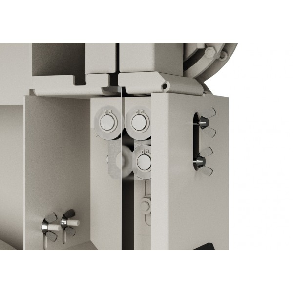 Roues en fonte à haute inertie, tournant à 715 RPM sur des roulements étanches et brosse de nettoyage sur la roue inférieure.